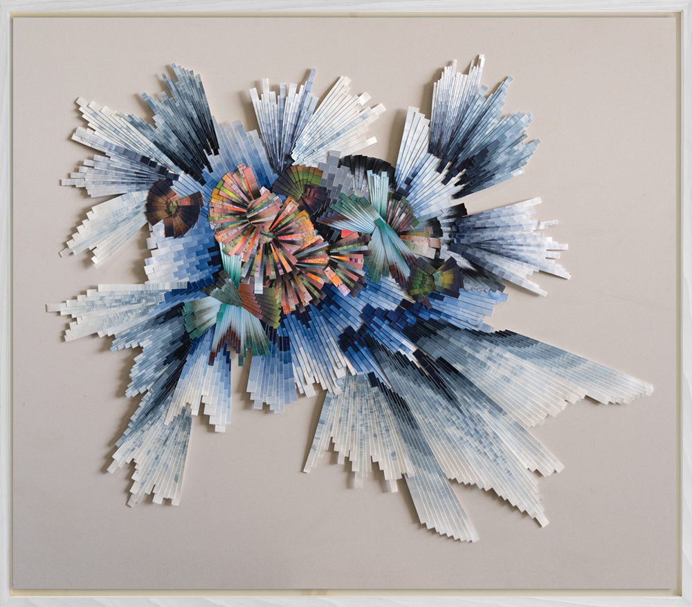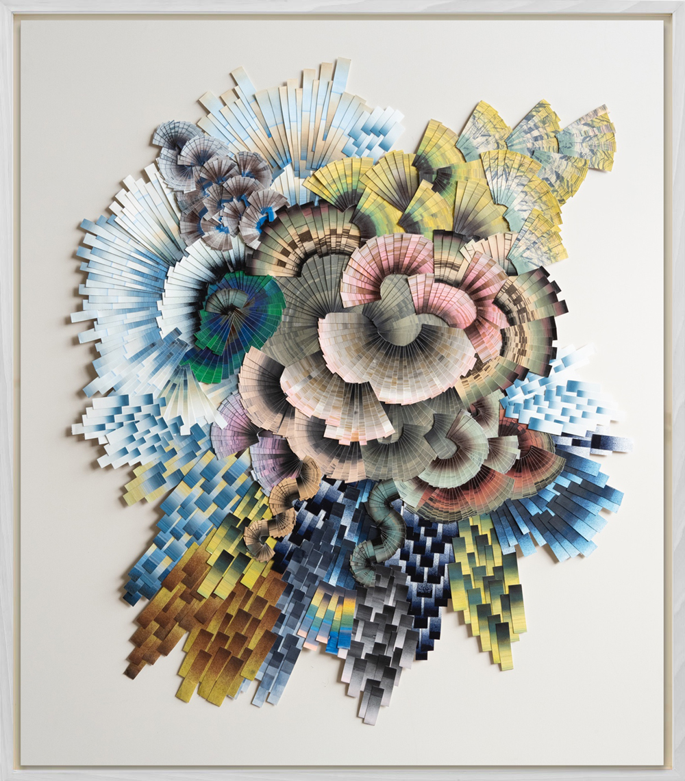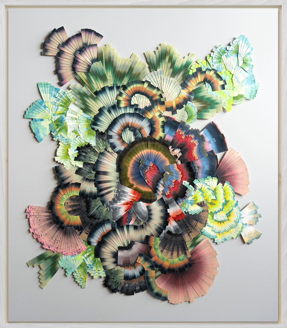 Lyndi Sales created the works in her (Un)Known Realms exhibition with a process that involved the accumulation of thousands of pieces of paper–each with its own unique color combination, gradation, fragmented brush texture, and shape–reconfigured into an abstract composition. Sales works intuitively from the center outwards and her palette is guided by contrasting color combinations and spiraling compositions that come to her through experiences with plant medicine and connections to mythological archetypes.