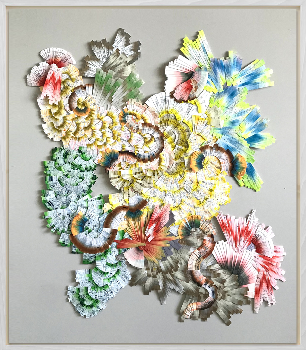 Lyndi Sales’s work exists at the interface of art and rationalism, reason and wonder. Working with hand-woven textiles, sculptural installation, intricately cut perspex, and paper and collage works, Sales’s pieces are located in a scientific register where she often interrogates the properties of light or the crystalline structure of chemicals. Her surprising combination of art and science take on new and curious configurations that often illuminate the fragile nature of our existence and temporality. In this exhibition, through the process of deconstruction, in the form of cutting up sheets of hand painted paper and found paper maps, she reassembles the fragments into abstract musings to create depictions of new territories or portals to unfamiliar and undiscovered places.